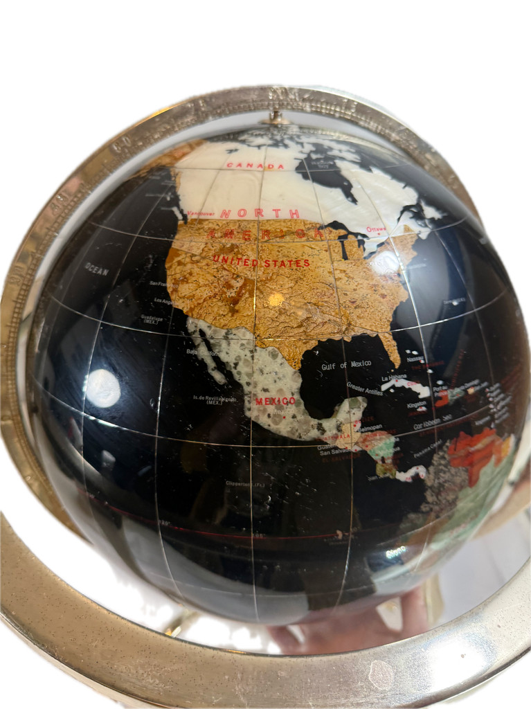 : Vintage Gemstone Inlay World Globe on Brass Stand 18in Rotating