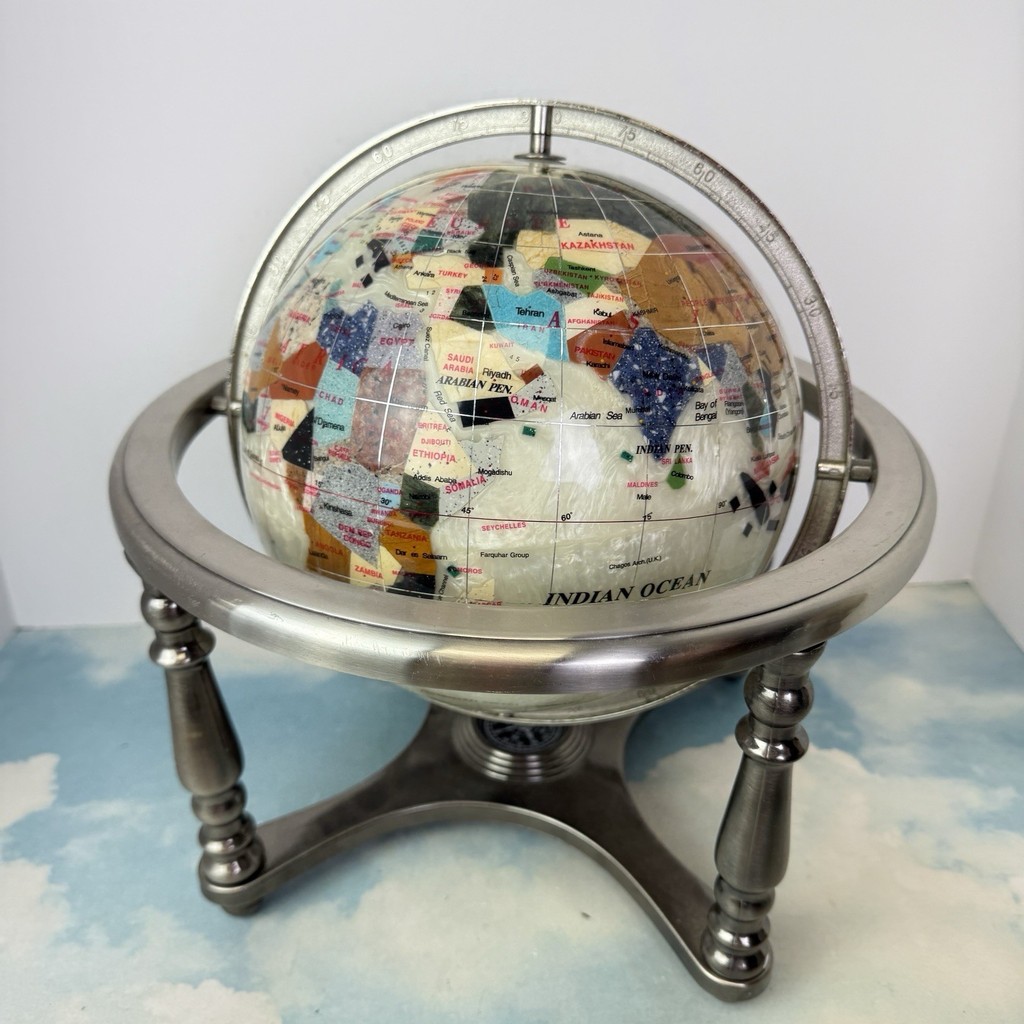 Gemstone Inlaid World 12 Globe Brass Zodiac Stand & Compass