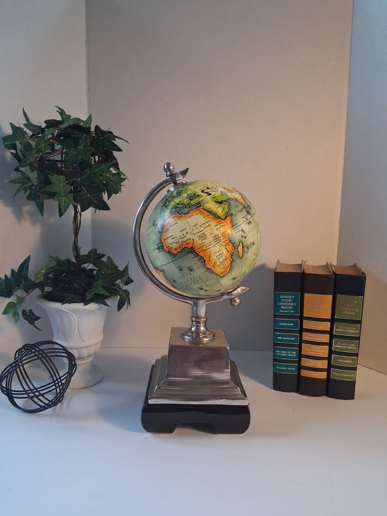 Semi Precious Gemstone Inlaid 15 World Globe With Compass in Brass Stand MCM