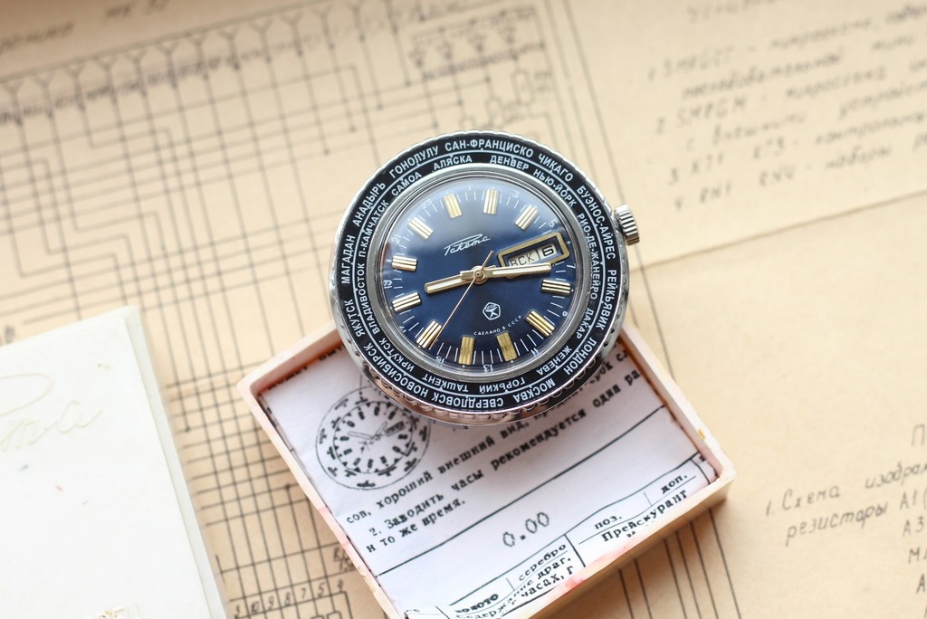 Men Blue Wristwatch Raketa Cities World Time Soviet Vintage Rocket Watch