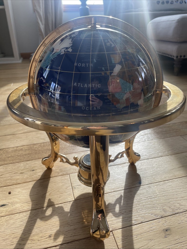 VTG Miniature Gemstone Gold Inlay Globe Brass Stand Desk Office Decor World Map