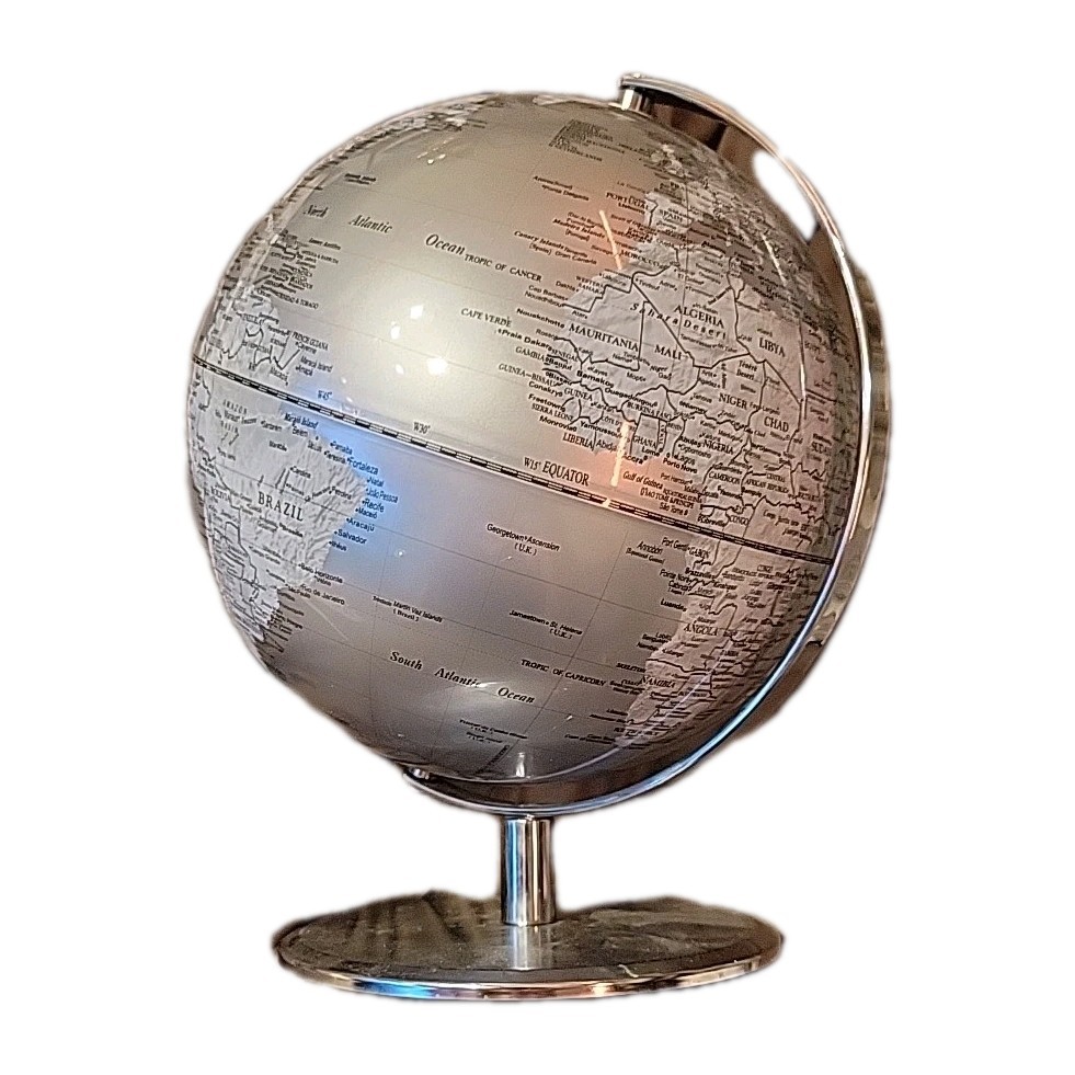 White and Silver Rotating Globe, Chrome Coloured Base Desk Atlas World Map Globe