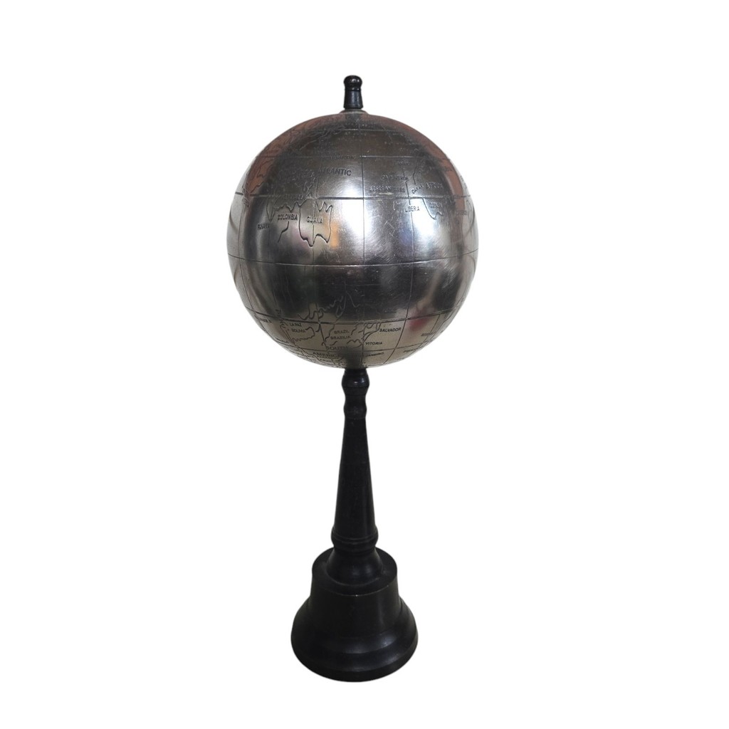 Vintage Etched Aluminum World Globe Desk Map Silver Metal Black Wood Stand.